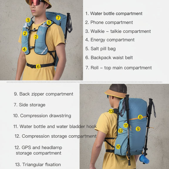 Met een inhoud van ca. 40 liter biedt deze rugzak voldoende ruimte voor kleding, voeding, water en accessoires. Ideaal voor trailrunning, hiking, dagtochten en outdoor avonturen.