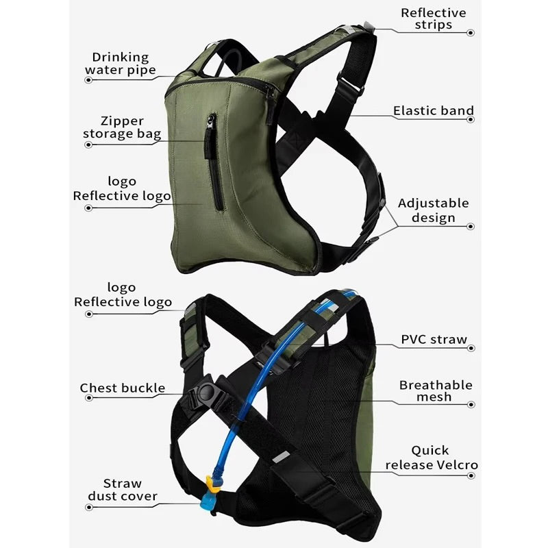 De rugzak combineert een ergonomisch ontwerp met duurzame materialen, een ademend rugpaneel en een PVC drinkslang waarmee je onderweg gemakkelijk drinkt zonder te stoppen. Dankzij de verstelbare banden, borstgesp en quick-release design blijft de rugzak altijd stabiel op je rug – zelfs bij intensieve beweging.